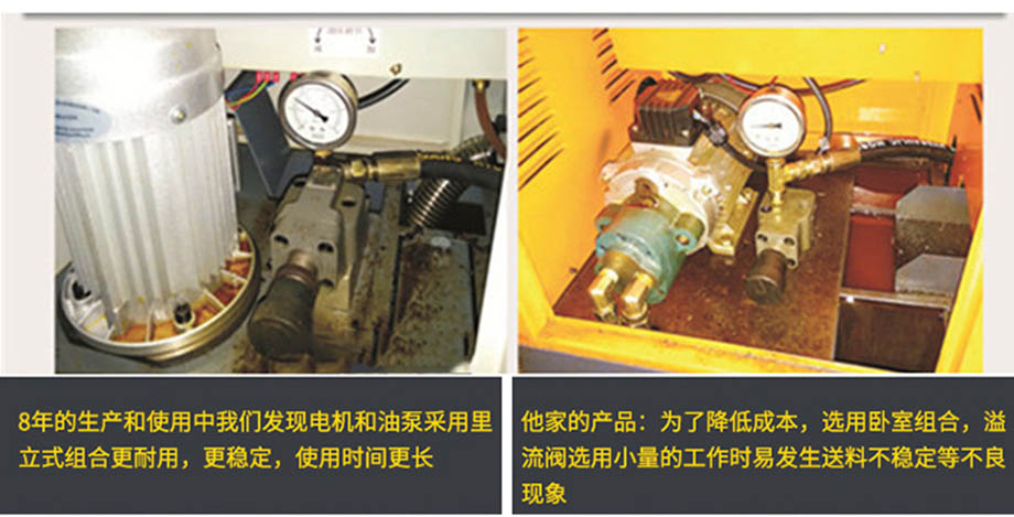 超過10年的生產(chǎn)和使用中我們發(fā)現(xiàn)電機(jī)和油泵采用里立式組合更耐用,更穩(wěn)定,使用時(shí)間更長(zhǎng)。有個(gè)別廠商為了降低成本,選用臥式組合,溢流閥選用小量的工作時(shí)易發(fā)生送料不穩(wěn)定等不良現(xiàn)象。
