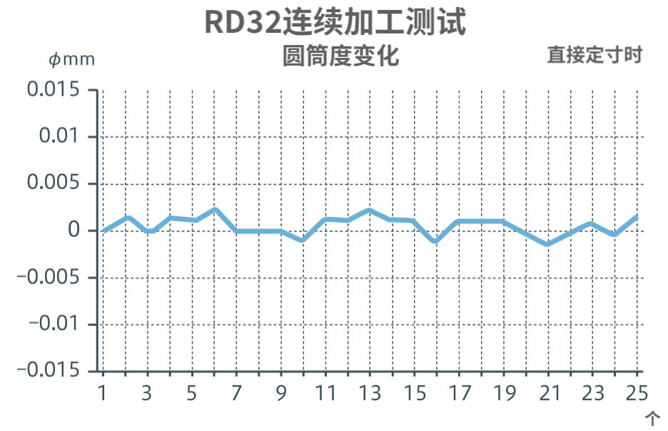 通過提高主軸、進(jìn)給軸等的機(jī)械構(gòu)造精度和剛性,以及進(jìn)給  控制的最小指令單位φ0.1μm,實(shí)現(xiàn)高加工精度。重復(fù)加工精度穩(wěn)定,即使在冷卻啟動(dòng)時(shí),1小時(shí)后的圓筒度變化也為φ3μm/50mm(RD23/RD32)。